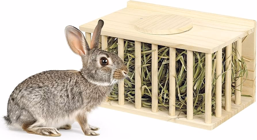 - Contenedor con Apertura Frontal: Pueden ser de plástico o madera, con una abertura frontal o lateral para que el conejo acceda al heno. Se pueden colocar en el suelo o colgar.